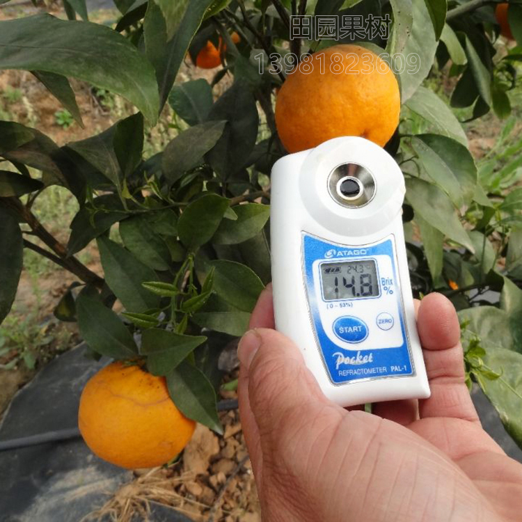四川省農業科學院薔果基地(謝仁兵)、成都田園果樹研究有限公司(方強),沃柑測糖時間:2018年3月27日下午17點30分,龍泉驛區薔果沃柑基地內,天氣晴朗、陽光明媚,氣溫在20-25度左右,微風,種植沃柑基地土壤為黃壤土,樹齡兩年,每棵樹結果在十五個至五十個之間,在基地內現場抽樣采摘三個不同田塊樣品果,現場用水果專業測糖儀器,第 一次測得含糖量(可溶性固物)在14.0度、******次測得14.5度、第三次測得14.8度,14.8度為三次含糖量高糖度,沃柑屬于低酸高糖品種。