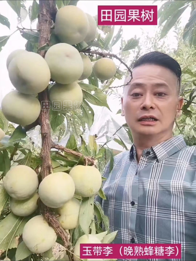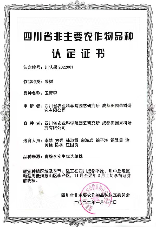 玉帶李(晚熟蜂糖李 ) 2022年1月17日 經四川省非主要農作物品種認定證書為:玉帶李(認定編號川認果2022001)育種者及申請者:四川省農業科學院園藝所、成都田園果樹研究有限公司 ,特征:晚熟蜂糖李個果大,自花結實,糖度極高,糖度可達21.5度,一般含糖量達18~19度之間,樹勢較強壯;海拔660米到740米果實八月上旬成熟,海拔越高成熟越晚,比貴州蜂糖李晚熟將近15天至20天,單果重50克,大果重100克左右,果實成熟后果面微黃,皮薄,肉質白黃色,成熟后橙黃色,口感松脆、化渣、濃甜,玉帶李(晚熟蜂糖李)是繼貴州蜂糖李后又選育一個極晚熟的李品種,三、四年生樹單株可達20斤-30斤,是一個不多得稀有品種,各地可大力提倡發展。適應種植區域及季節,適宜在四川成都平原,川中丘陵區域和盆周低海拔山區李產區,11月至數年3月上旬李苗萌芽前栽植。
