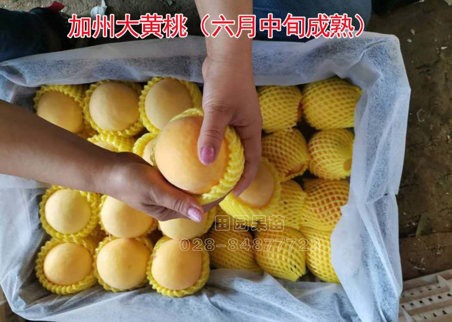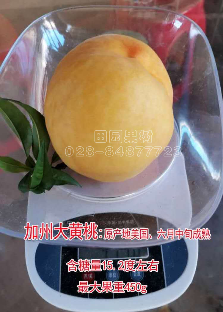 加州黃桃(美國):高檔鮮食黃桃品種,果實6月中旬成熟,果個大,產量高,平均單果重245克,大果重450克,硬溶質,果實表面茸毛中等,底色黃,成熟時不套袋多數著深紅色,套袋后外觀金黃,果肉黃色,硬溶質,肉質細,汁液中多,風味濃甜,近核處有紅色素,可溶性固形物含量15%左右,總糖含量13.6%,總酸含品質特優,黏核,花型大,花粉多,自花結實,美國加州黃桃優與國內其它黃桃品種,在中國南北均可栽種,是一個值得發展的新型高檔黃桃新品種。